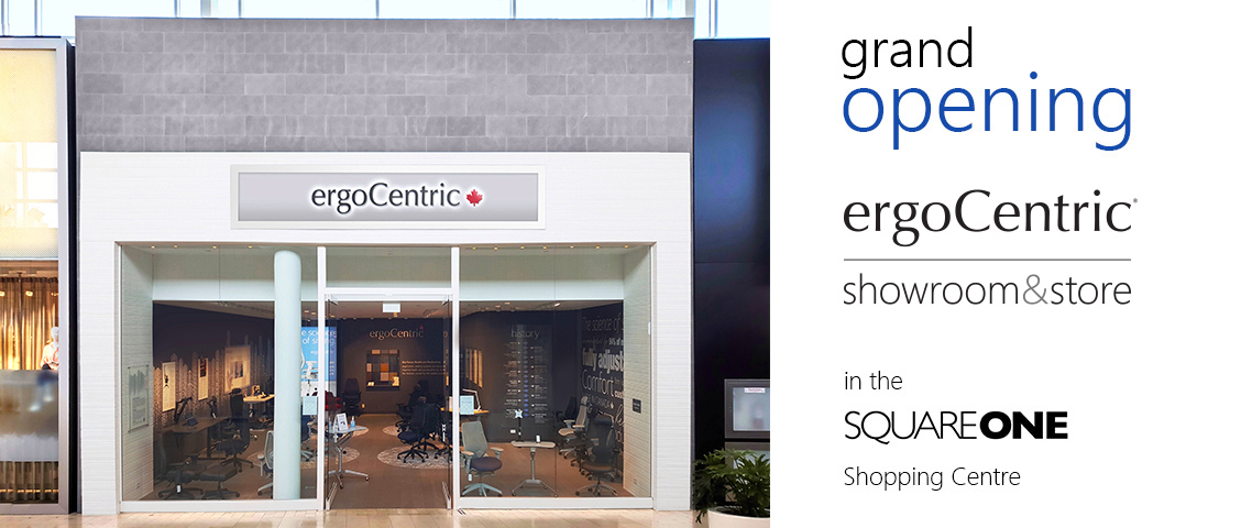L’espace démo-boutique de Square One est ouvert du lundi au dimanche de 11 h à 19 h. ergoCentric dispose désormais de trois magasins de détail dans la grande région de Toronto, les deux autres étant situés à l’hôtel King Edward et au centre commercial Yorkdale, ainsi que de cinq salles d’exposition au Canada. Les systèmes d’assise d’ergoCentric sont fabriqués en Ontario, au Canada.
