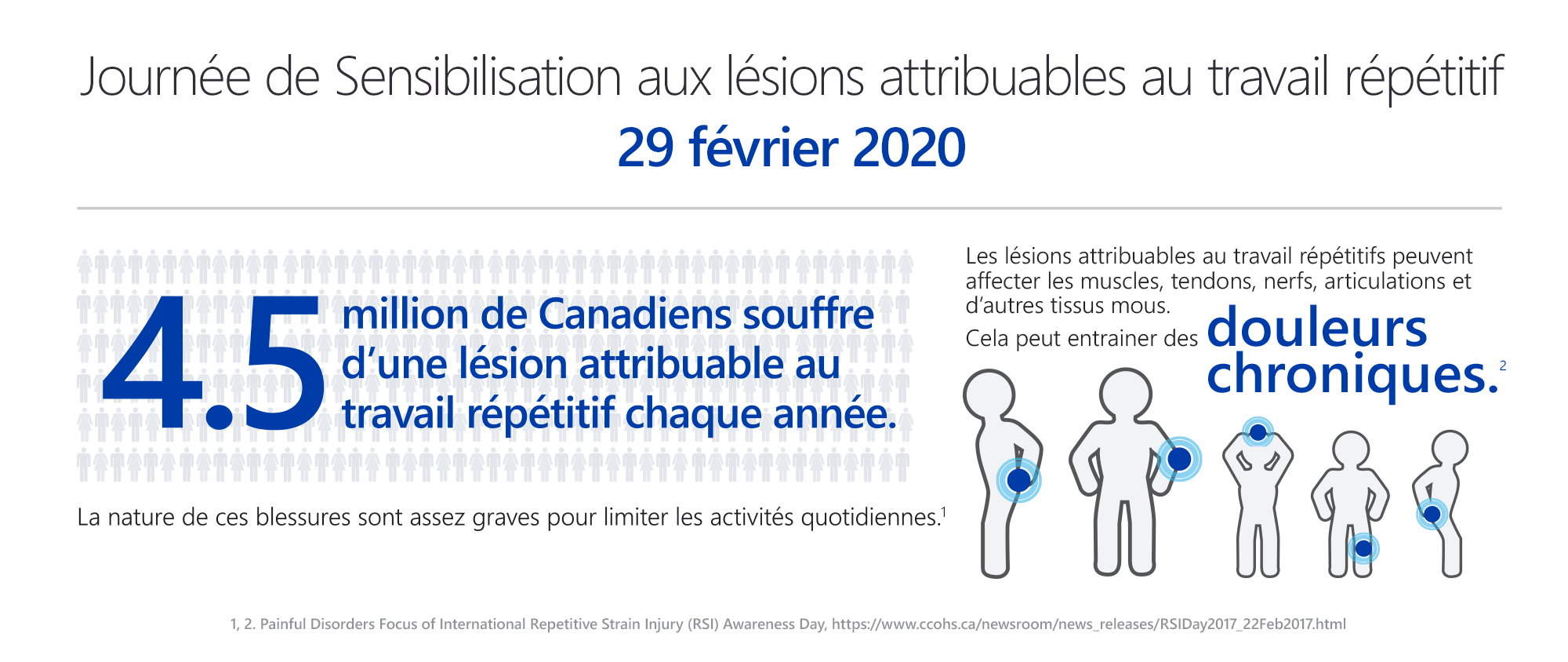 Le dernier jour de février, lors de la seule journée calendaire non répétitive, de nombreux événements partout dans le monde soulignent la Journée de sensibilisation aux lésions attribuables au travail répétitif, qui visent à favoriser la sensibilisation du public aux troubles musculo-squelettiques – douloureux mais évitables.
