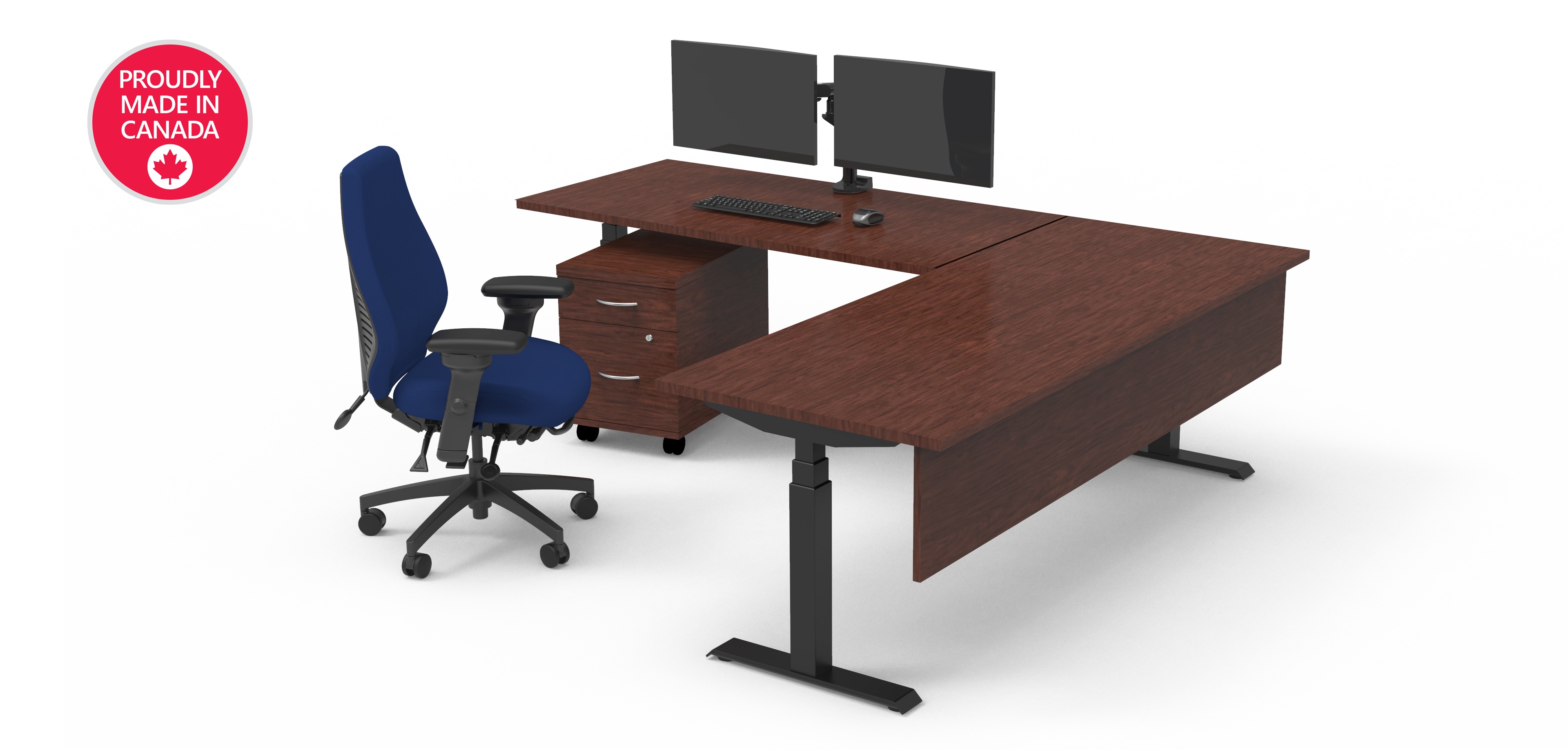 Shown in photo: airCentric™ 2, upCentric® 3 Leg L-Shaped electric height adjustable desk, Zgonic monitor arm, modesty panel and storage pedestal.